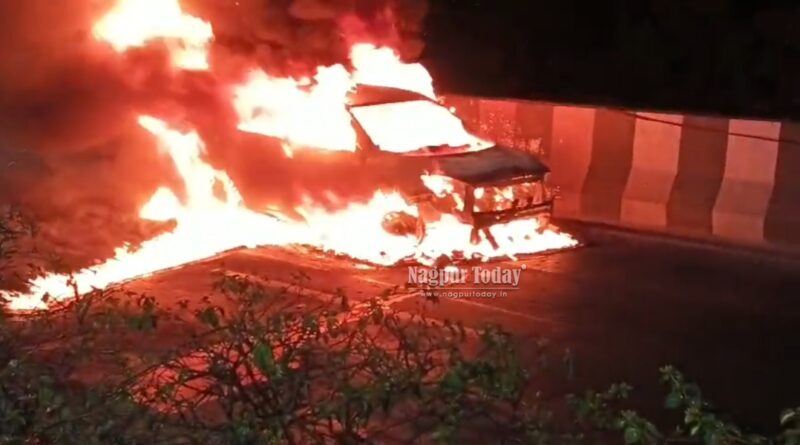 Nagpur: Panic gripped commuters on Wednesday evening after a moving car caught fire on the double-decker flyover on Wardha Road, leading to a massive traffic jam during peak hours.