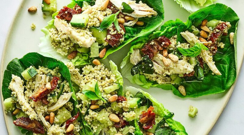 Serve this pesto chicken and couscous salad in lettuce leaves for a healthy supper. Add sundried tomatoes and pine nuts for additional texture and nutrients for a fuss-free meal.