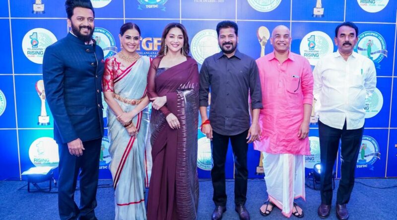 Telangana Chief Minister A. Revanth Reddy, along with actors Riteish Deshmukh, Genelia Deshmukh and Madhuri Dixit, at the Gaddar Film Awards in Hyderabad on Thursday.