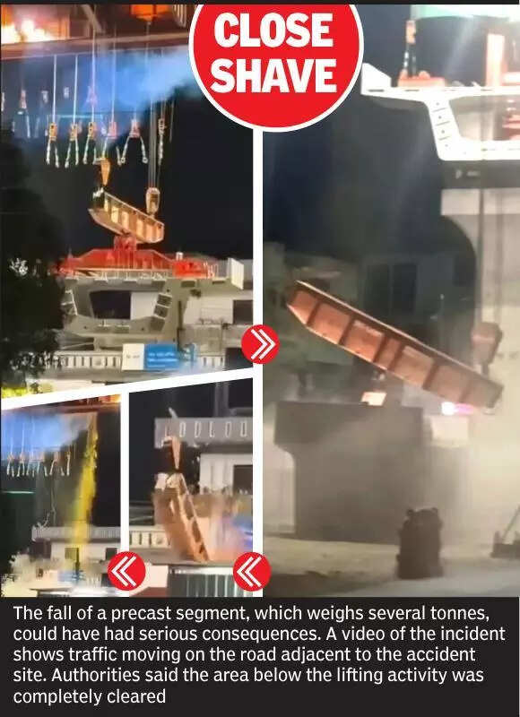 Nagpur: A precast concrete segment being erected for Phase-II of the Nagpur Metro project crashed on Friday evening after a winch wire rope snapped mid-operation in the Wanadongri area. The incident exposed an electro-mechanical failure in the heavy launching equipment used for elevated corridor construction. No injuries were reported, as workers were not present under the suspended load at the time of the incident.The incident occurred around 7.30pm at Reach 3A on the Hingna corridor stretch, a busy arterial road witnessing heavy daily traffic near a popular retail supermarket, where the private contractor was carrying out routine segment erection work using a launching girder. While five segments were successfully placed, the accident occurred during the lifting of the sixth concrete segment.According to senior MahaMetro officials, the left-hand side winch (a mechanical device mounted to the structural beam to lift, lower, or pull heavy loads) of the launching girder developed a technical snag while hoisting the segment, triggering the equipment’s safety alarm. Engineers at the site attempted to bring the suspended segment down in a controlled manner after detecting the fault.The concrete block, initially hanging about 6 metres above the ground, was gradually lowered when the winch wire rope suddenly snapped at around 2 metres above ground level. The failure caused the heavy segment to drop to the ground within the barricaded construction zone. Work on the Hingna stretch was stopped after the accident. A video of the incident, shot by a passerby, soon went viral on social media. After the wire snapped, the fuel pipe also burst, resulting in a heavy flow of fuel from the girder onto the road.A senior official said an order has been placed for a new winch system costing around ₹25 lakh. The precast segment that collapsed is estimated to cost about ₹3 lakh, taking the total loss in the incident to nearly ₹28 lakh. The official added that further investigation is underway to find out the exact cause behind the incident.The fall of a precast segment, which weighs several tonnes, could have had serious consequences if workers or passersby were present in the immediate vicinity. Authorities said the incident was contained within the restricted work area, as safety protocols during such operations require the area below lifting activity to remain completely clear.