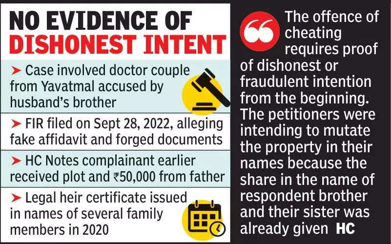 Nagpur: Coming to the rescue of a doctor couple from Yavatmal, the Nagpur bench of Bombay high court ruled that a family property dispute cannot be given a criminal colour in the absence of evidence of fraud or dishonest intent, quashing criminal proceedings against them.Justice Pravin Patil set aside proceedings pending before a judicial magistrate first class, holding that the case stemmed from a civil dispute among family members rather than a criminal act.A police complaint was filed by the husband’s brother on Sept 28, 2022, against their mother and other siblings, alleging that they prepared a false affidavit and fabricated documents to exclude his name from the list of legal heirs of their father before mutating their names in property records.Based on the complaint, police registered offences under IPC sections for cheating, forgery and dishonest concealment of property.After examining the record, the court noted that the brothers’ father died on Jan 1, 2014, and that the complainant himself acknowledged receiving a plot and ₹50,000 from his father, after which he began living separately.The bench also recorded that an application seeking issuance of a legal heir certificate was filed by another brother on July 13, 2020, and the certificate was issued in the names of several family members.Justice Patil observed that the allegations against the petitioners were minimal. “The role attributed to the petitioner-husband is only to the extent that he has put signature to the affidavit prepared by his other brother,” he noted, adding that there were virtually no allegations against the petitioner’s wife.The court also took note of the fact that the complainant’s name was later entered in the property card and that the petitioners earlier expressed willingness to include him as a legal heir after learning about the dispute. Justice Patil observed that the complaint appeared to be an attempt to convert a civil disagreement into criminal litigation. “The respondent brother with oblique motive and to give colour of criminal offence to the civil dispute existing between the parties, lodged the complaint against petitioners,” he said.Referring to a 2003 judgment of the Supreme Court, the Bench reiterated that courts must carefully examine surrounding circumstances where criminal proceedings are initiated in disputes that are essentially civil in nature.The court further clarified that the offence of cheating requires proof of dishonest or fraudulent intention from the very beginning of the transaction. “The petitioners were intending to mutate the property in their names because the share in the name of respondent brother and their sister was already given during the lifetime of the father,” the judge observed, concluding that no criminal intention could be inferred.The bench also emphasised that mutation entries in revenue or property records are made primarily for administrative purposes and do not by themselves create ownership rights over immovable property. Since the ingredients of cheating were not established, the court held that the allegation of forgery could not stand either, as forgery must be committed with an intention to cheat. Holding that continuation of the prosecution would amount to an abuse of legal process, the court quashed the criminal proceedings and the chargesheet against the petitioners.Key takeaways from HC verdictCase involved doctor couple from Yavatmal accused by husband’s brotherFIR filed on Sept 28, 2022, alleging fake affidavit and forged documentsNotes complainant earlier received plot and ₹50,000 from fatherLegal heir certificate issued in names of several family members in 2020Petitioners’ role limited to signing affidavit prepared by another brotherComplainant’s name later added to property cardMutation entries are administrative and do not create property title