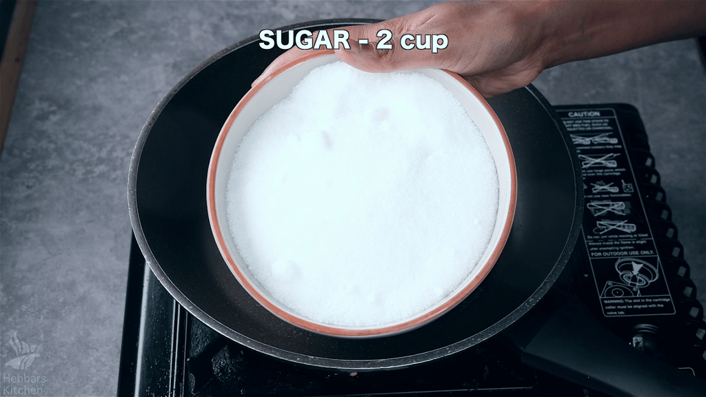 - In a pan, take 2 cup sugar, 1 cup water, few saffron, and pinch of food colour. Mix well.