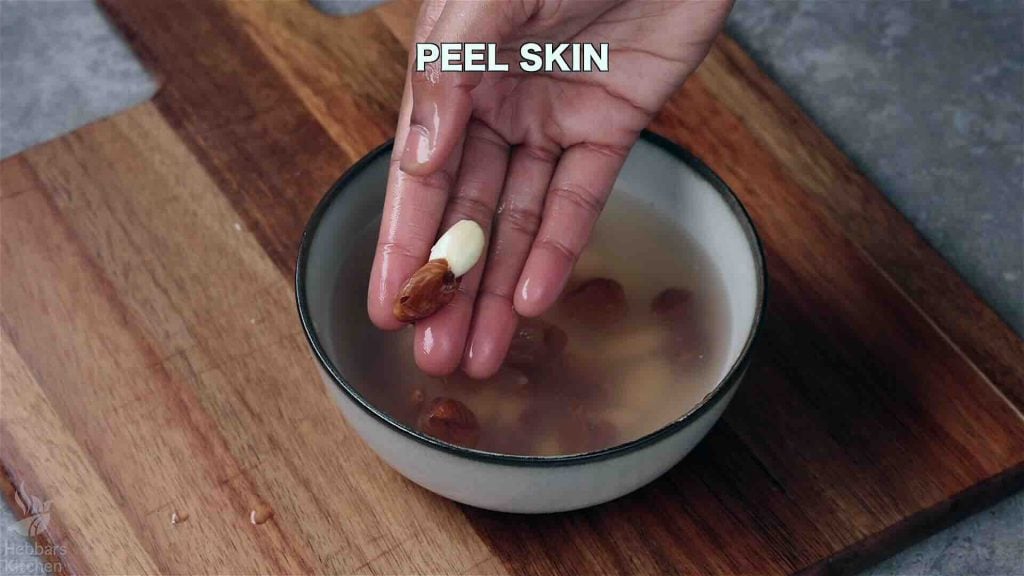 - Take 20 almonds in a bowl and soak them in hot water for 10 minutes.