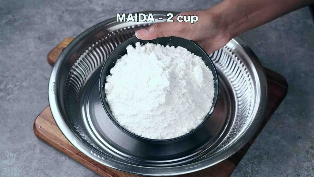 In a large bowl, take 2 cup maida, 2 tbsp fine rava, ½ tsp turmeric, and ½ tsp salt. Mix well.