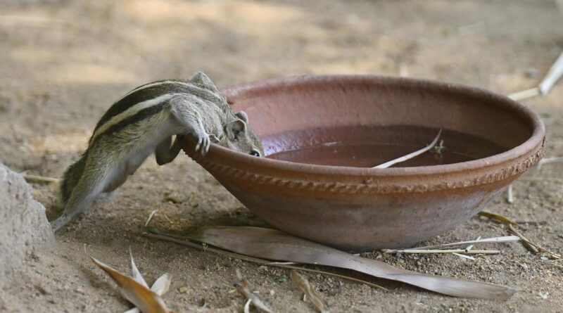 A thirsty squirrel drinks from a water bowl placed by a good samaritan during a hot summer afternoon at Public Gardens in Hyderabad on Thursday (April 16, 2026)