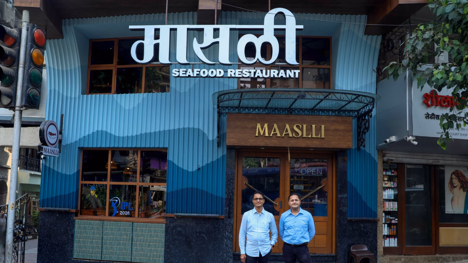 We meet them at Maaslli’s Kemps Corner outpost, which opened in late December 2024 and seats nearly sixty across 1,200 square feet. Designed in collaboration with architect Nitin Hankare, the space leans into its coastal identity. The facade curves like a wave. Inside, a glass mosaic of two fish runs along one wall, while the ceiling mimics water — an upside-down boat and oar suspended above. The opposite wall is textured to resemble a coastline, with actual sand worked into the surface.