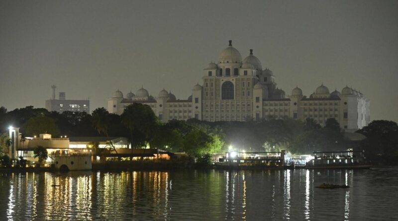 Lights are turned off at the Secretariat to observe Earth Hour 2026, in Hyderabad on Saturday.