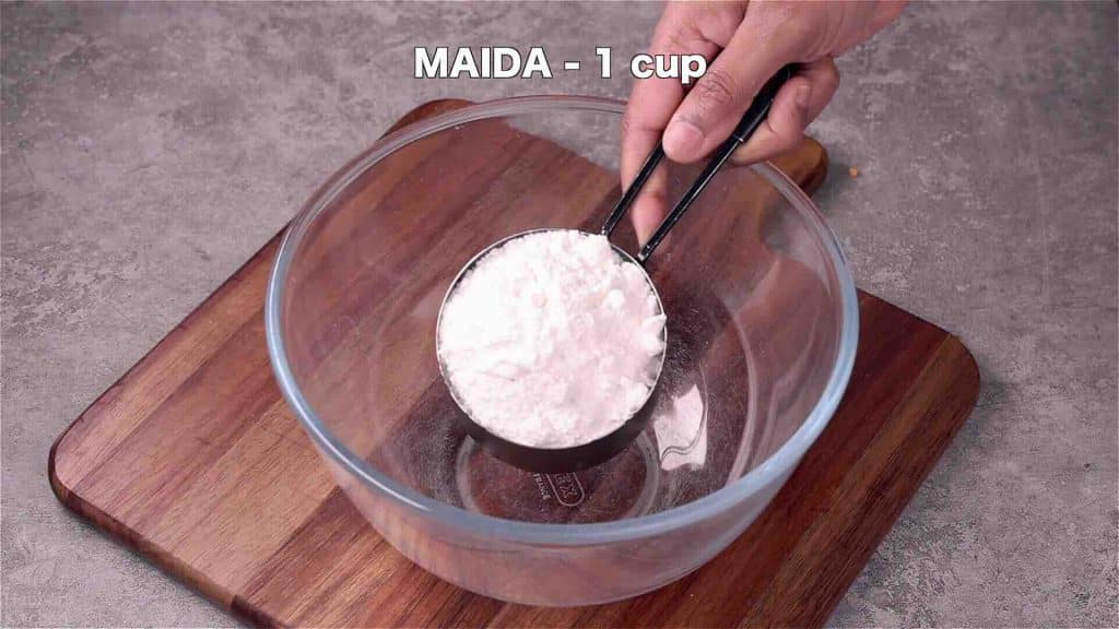 - Firstly, in a bowl, take 1 cup maiada, ¼ cup rava, 2 tbsp milk powder, ½ tsp fennel and ½ tsp cardamom powder.