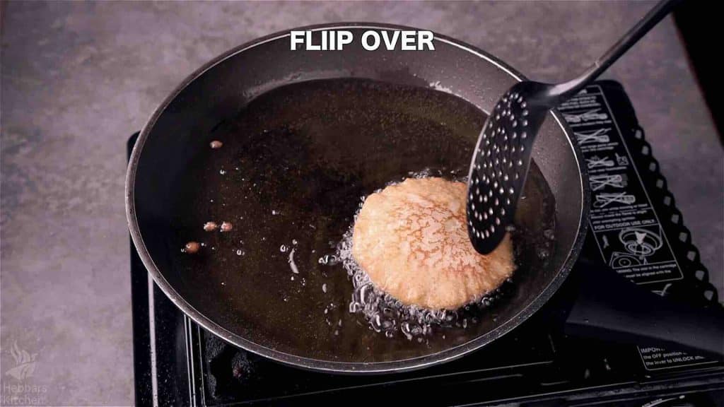 Flip over and fry both sides until the malpua is cooked through.