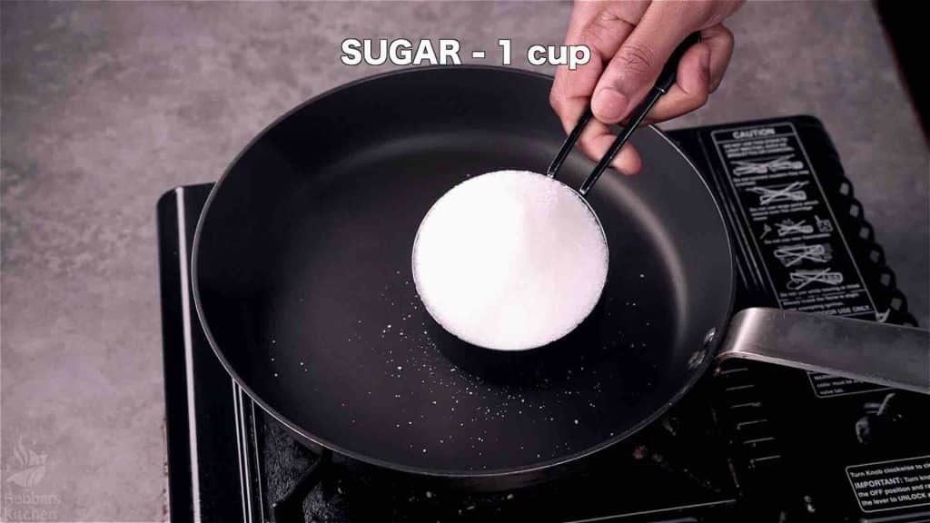 - Meanwhile preapre the sugar syrup. In a pan, take 1 cup of sugar and 1 cup of water.