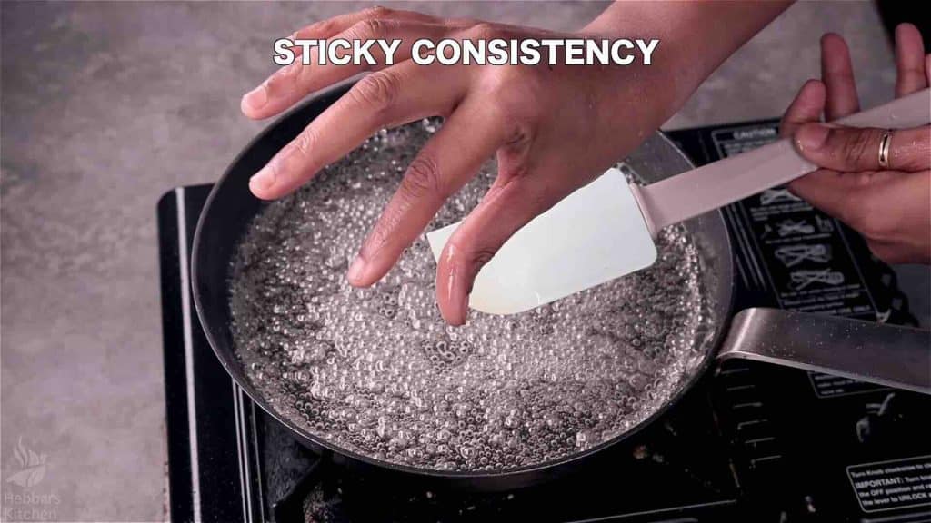 Boil till the sugar syrup turns sticky. Do not make a string consistency.