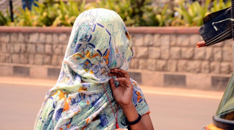 A young girl covers her head and face to protect herself from harsh sun in Sangareddy, Telangana.