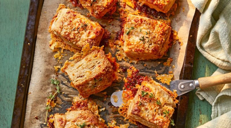 About 10 mins before baking, heat the oven to 220C/200C fan/gas 9 and mix 2 tsp milk with the Marmite, if using. Line a baking tray with baking parchment. Scatter half the remaining parmesan and all the grated cheddar over the tray, then sit the scones on top. Brush the tops with the milk and Marmite mixture (or just milk, if you prefer), then scatter over the remaining parmesan and the thyme sprigs. Bake for 20-25 mins until the scones are deep golden brown and puffed up, and the cheese on the tray is crisp. Cool on the tray for 10 mins, then serve warm as is or slathered with butter.