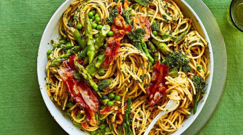 We have enjoyed our fair share of controversy when it comes to Italian staple dishes, so some may take umbrage to this twist on a carbonara with the addition of plenty of spring vegetables, but we think it’s worth the risk. Sweet peas and asparagus balance the saltiness of the pancetta and richness of the egg yolks, and add a couple of your five-a-day into an easy midweek meal. Bellissimo!