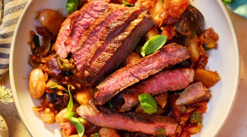 Smoky steak with caponata butter beans recipe