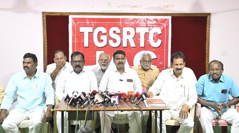 RTC Joint Action Committee (JAC) members address a press conference in Hyderabad on Tuesday (April 21, 2026)