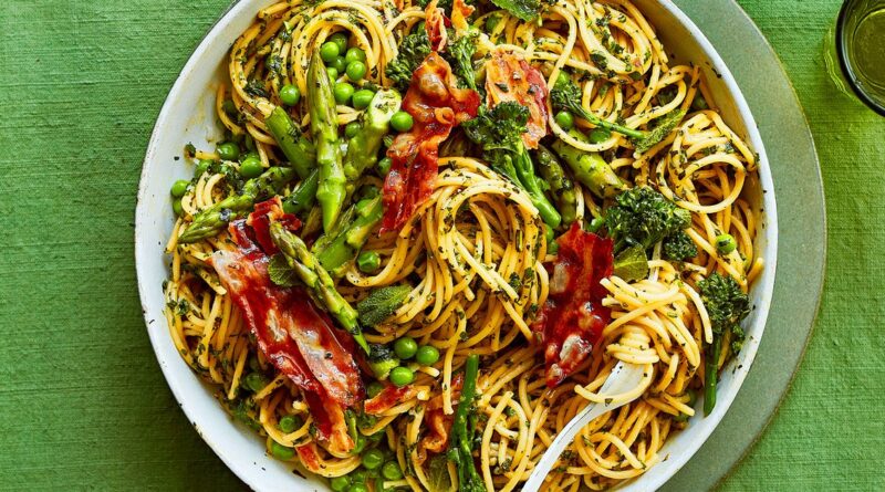 Seasonal spring greens, including broccoli, asparagus and peas, are the stars of the show in this comforting carbonara. Show off fresh herbs by adding chopped mint, basil and parsley. Add pancetta cubes or slices, guanciale or bacon lardons to boost the protein content.